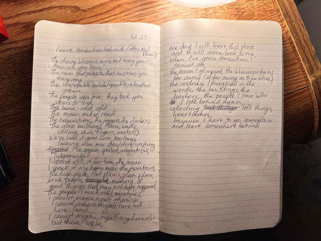 One day I will leave this place and it’ll come back to me, from somewhere I can’t see: the ocean I glimpsed sometimes, the mountains so far away as to be blue the coldness I imagined in the words, the buildings, the harbors, the relentless green, the cherry blossoms which bloom pleadingly the ones I love so tightly and on borrowed time