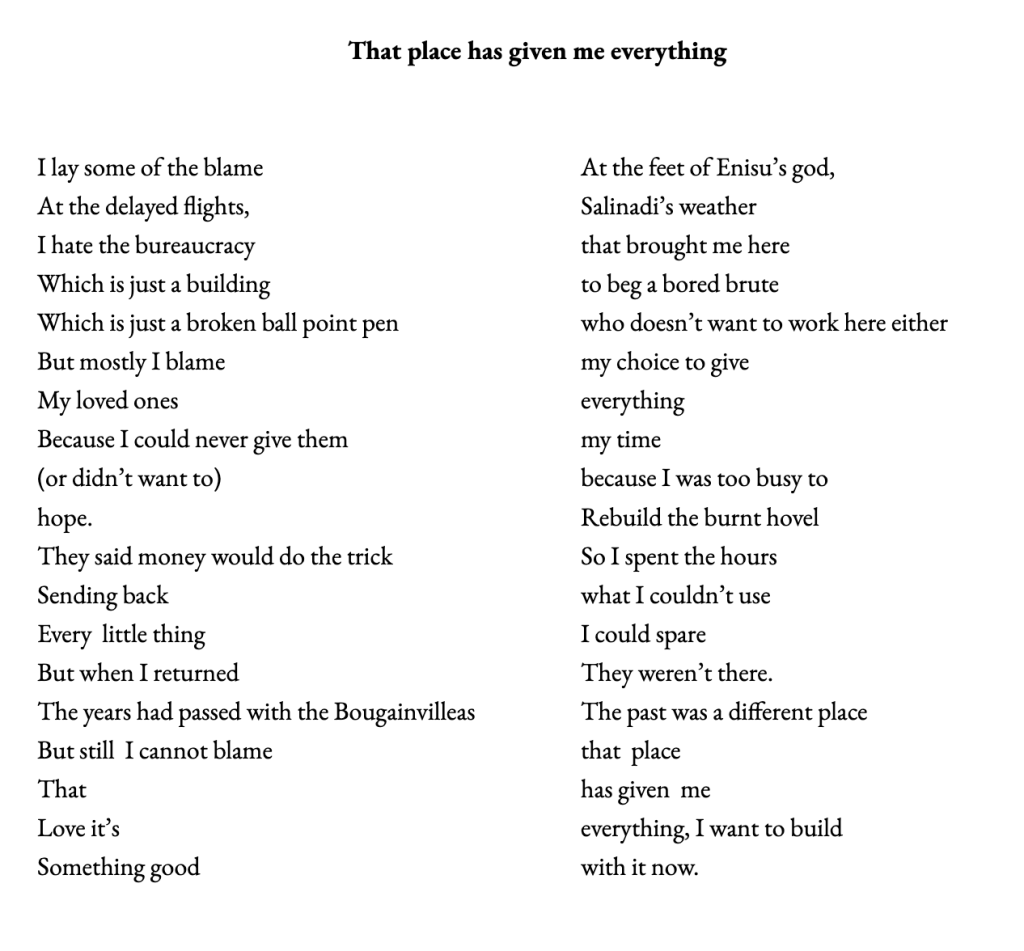 than a made thing bound by lokta and butcher’s twine. In our calls, Cimita never admits it’s getting late And there is work tomorrow I hear the things she doesn’t say. There is strength somewhere in withholding. She waits for Kousin or Sauba to speak. They don’t, but they still stay on the line.